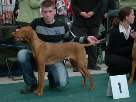 Už spomínaná výstava v Trenčíne bola pre nás veľmi úspešná :) v triede mladých sme boli ešte s ďalšími tromi fenkami: Bára z Malej Hôrky, Billie z Malej Hôrky a Jane Jantar Devil. Naša Gina sa rozhodcovi páčila najviac a preto sme získali V1, CAJC :) Naše obavy o jej trucovanie a strach v kruhu boli zbytočné. Zvládla to na jednotku. Šikulka :))